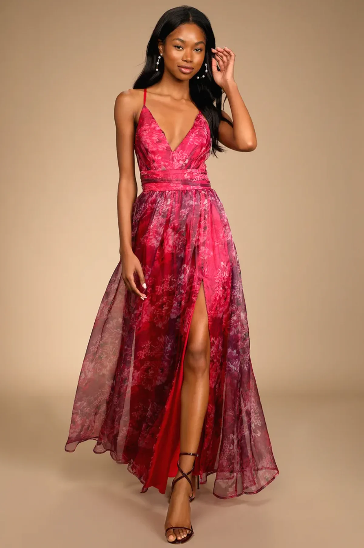 This stunning organza maxi dress is playful and stylish and allows for lots of movement, a necessity for hitting the dance floor. It has a subtle floral design available in rich magenta and soft dark teal, featuring a v-neck and a fitted bodice.