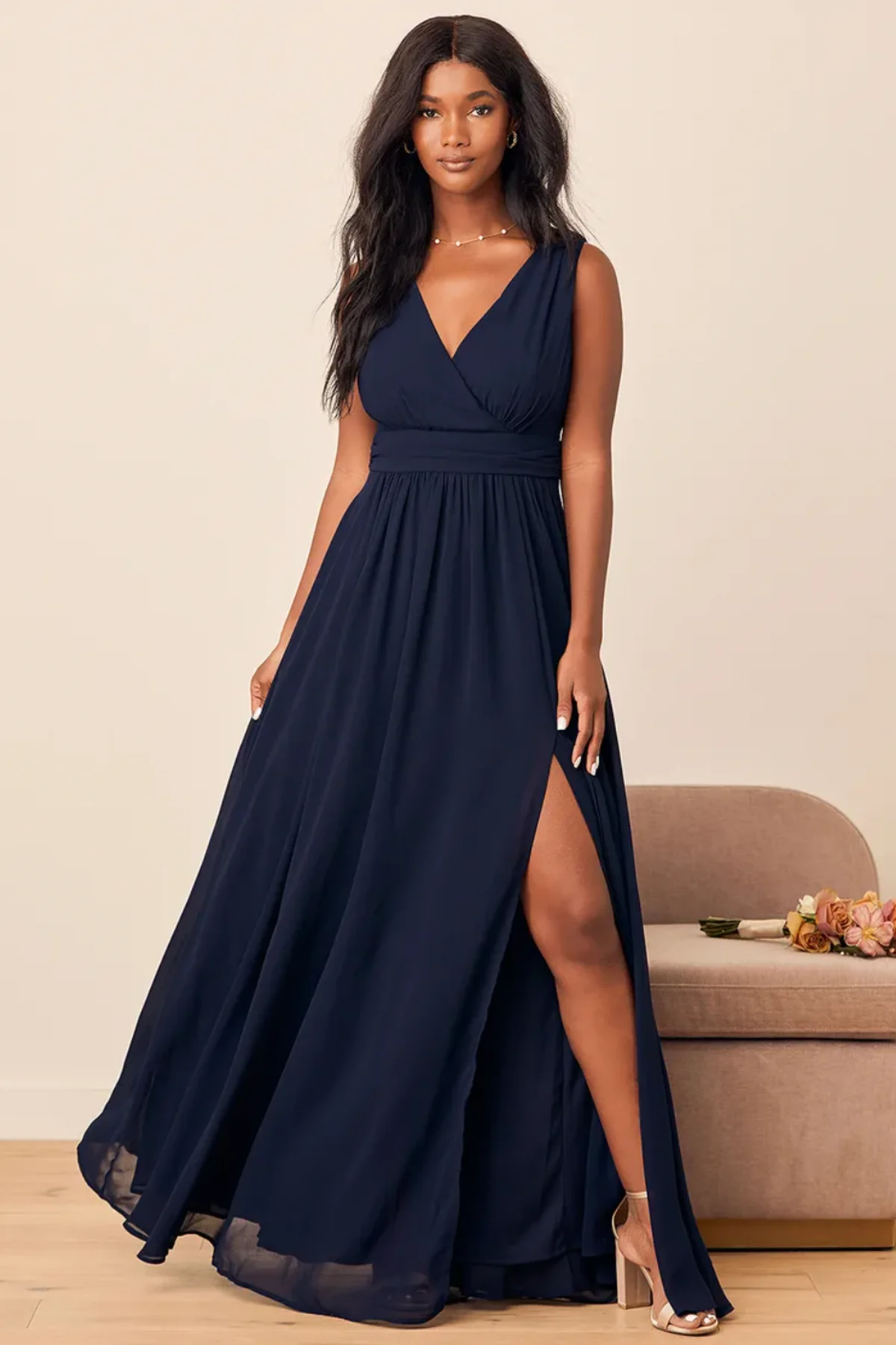 You can't go wrong with this breathtaking floor-length dress that mixes subtle draping with a cascading maxi skirt. It's available in six sizes and a dozen colors, including rusty rose, blush pink, lavender, and slate blue.