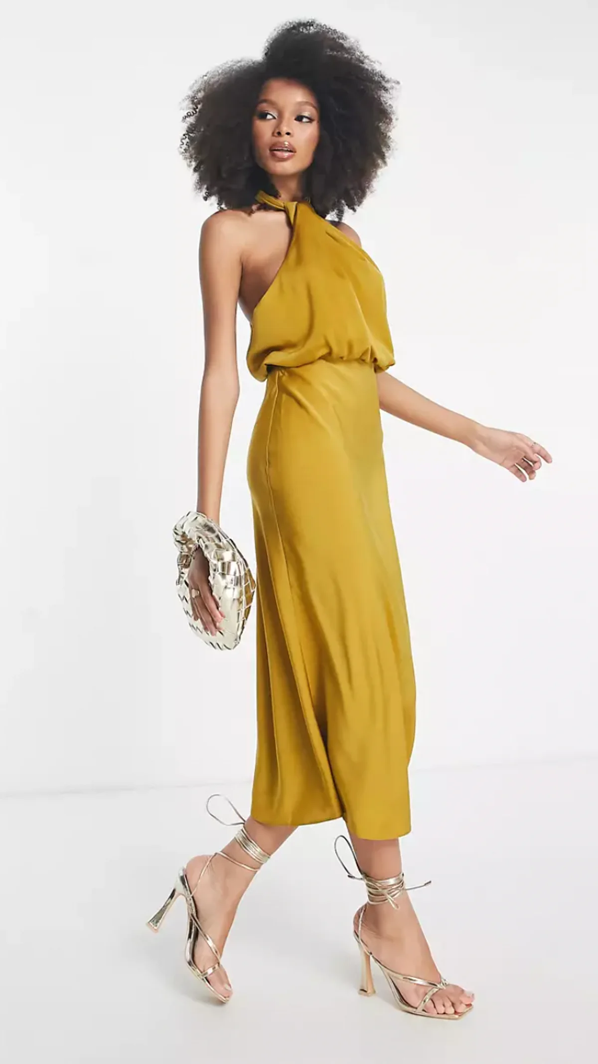 Dresses don't always need bold designs to make a statement; sometimes, simplicity is the best bet. This gold halter neck midi dress is made with smooth satin and is a showstopper you'll feel comfortable and confident in, all the way from start-of-evening pictures to dancing the night away.