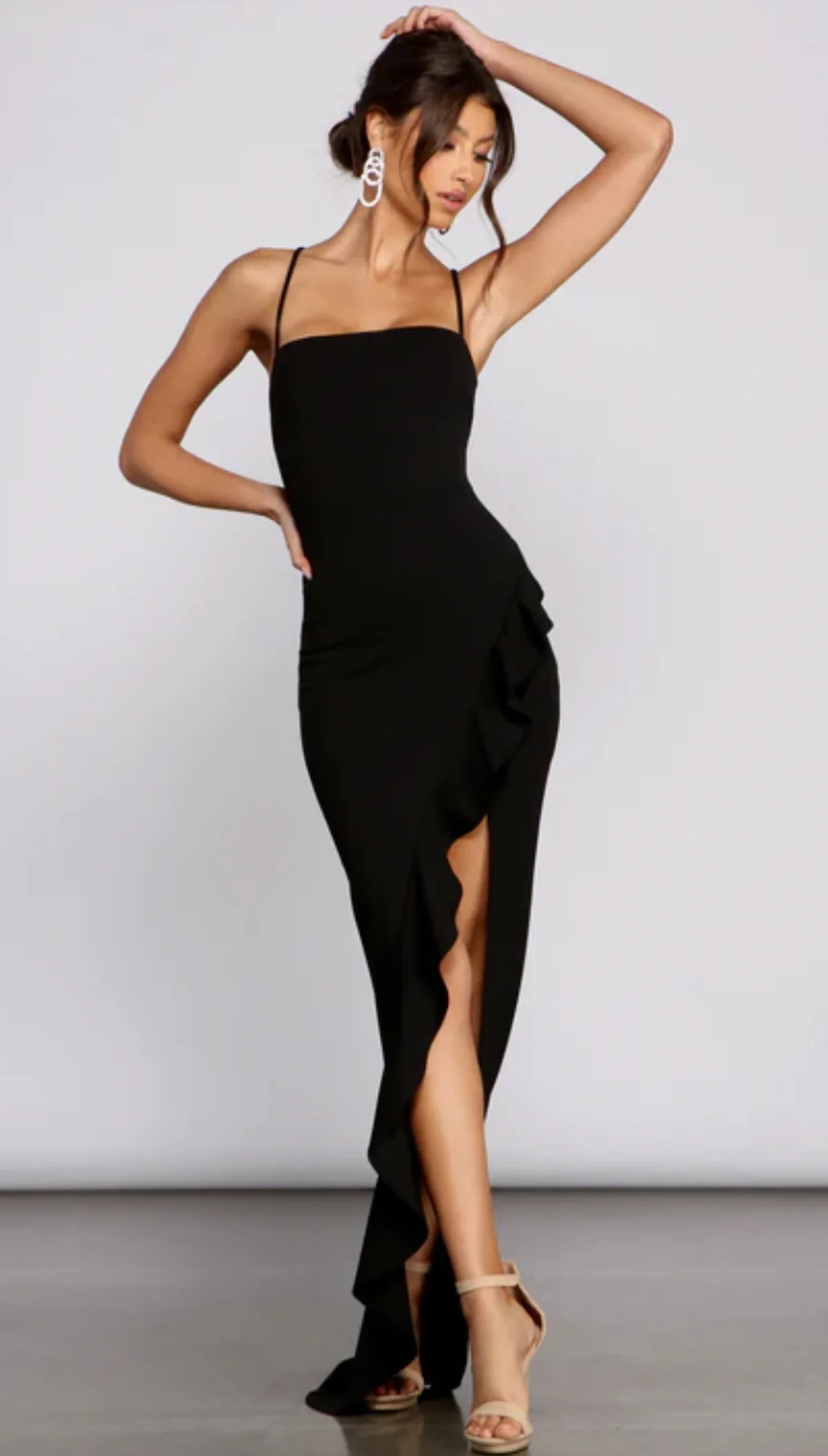 This dress is truly a show-stopper (true to its name) with its sleek black color featuring perfectly styled cut-outs and a one-shoulder design for an elegant dose of minimalism that meets modern fashion. Its fitted bodice flows into a maxi skirt style with a high slit.