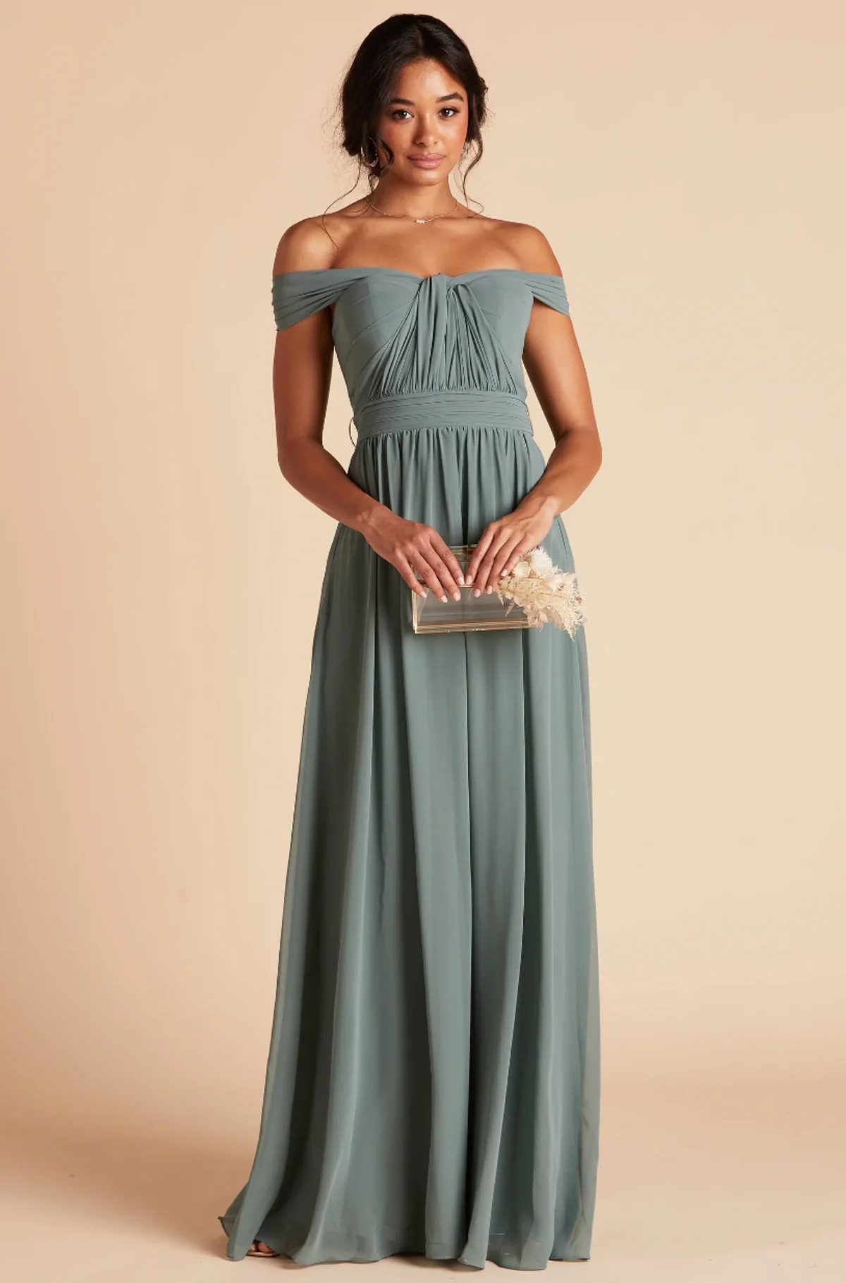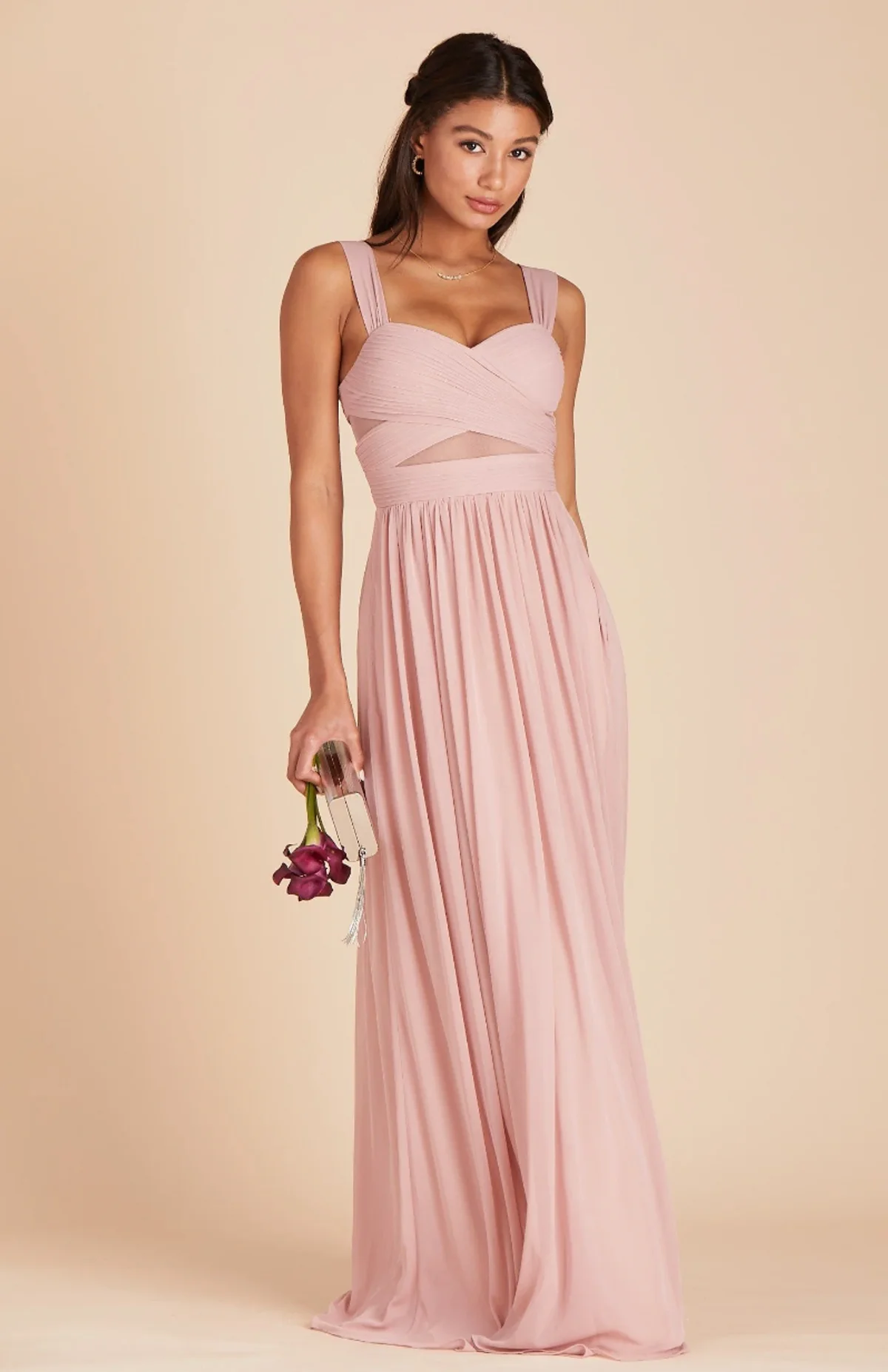 This dress is gorgeous, breezy, and comes in nine colors, including dusty rose, sea glass, and navy. It features subtle cutouts on the bodice covered with sheer mesh fabric and a fitted waist that flows into a breezy floor-length column skirt.