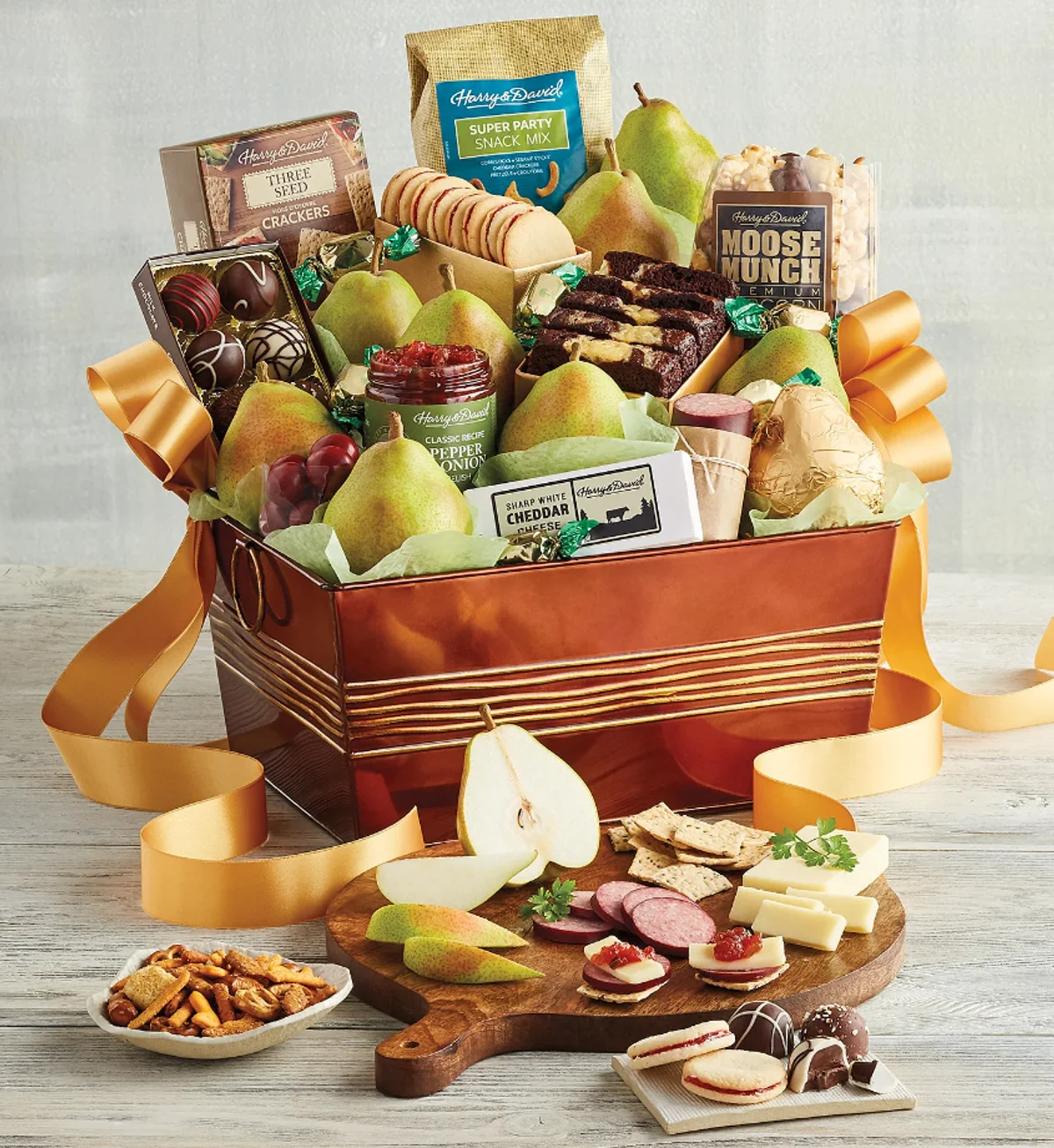 There is a gift basket for any possible occasion, so find one for your host that speaks to their personality and interests. This Grand Favorites gift basket from Harry & David includes a delicious assortment of fruit, cookies, truffles, snack mix, sausage, and more. You can even add extras to make it even more special.