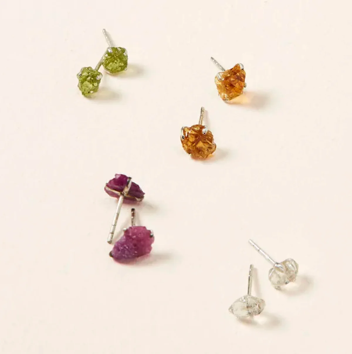 These raw stone studs have such an interesting imperfect beauty. They're totally unique from most other birthstone jewelry offerings. Handmade in Long Beach, California, the uncut crystals are set on minimalist, recycled sterling silver posts for an earthy, organic effect. Subtle yet stunning.