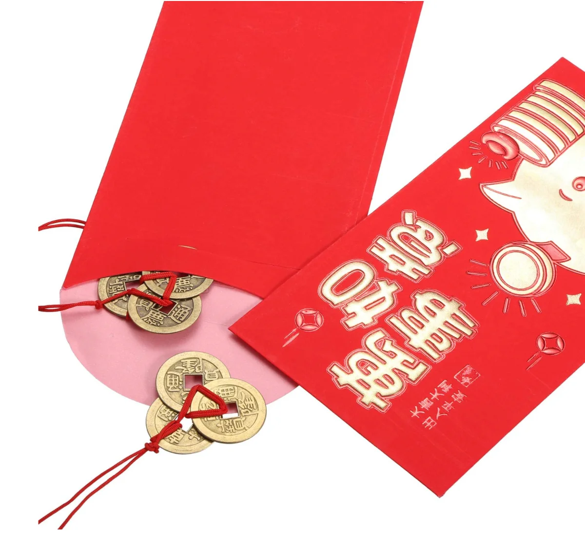 Chinese coins tied with a red ribbon or inside a red envelope are among the most inexpensive and luckiest gifts you can give to someone. An added benefit of giving these coins as a gift is that it also bestows wealth to you! Buy coins strung on red thread and hang them in multiples of three for prosperity. Tuck the hanging charm into an oversized red envelope for a traditional money gift during the Lunar New Year.