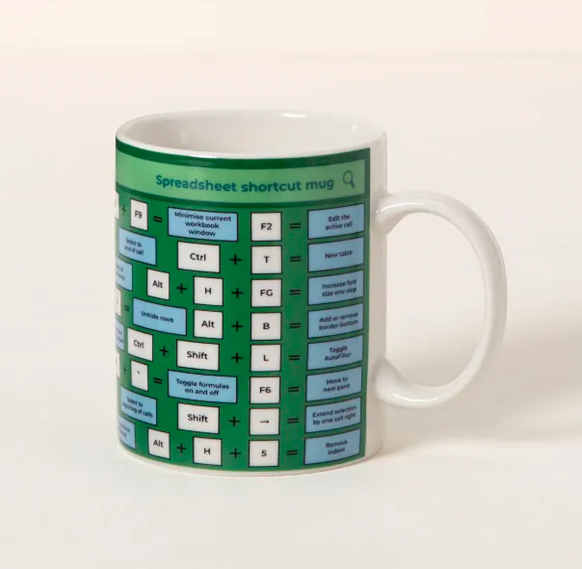 Did you pull the data entry wizard in your office Secret Santa this year? Gifting them this mug featuring over a dozen of the most common (and most helpful) spreadsheet shortcuts just might elevate you to the status of their new personal hero.