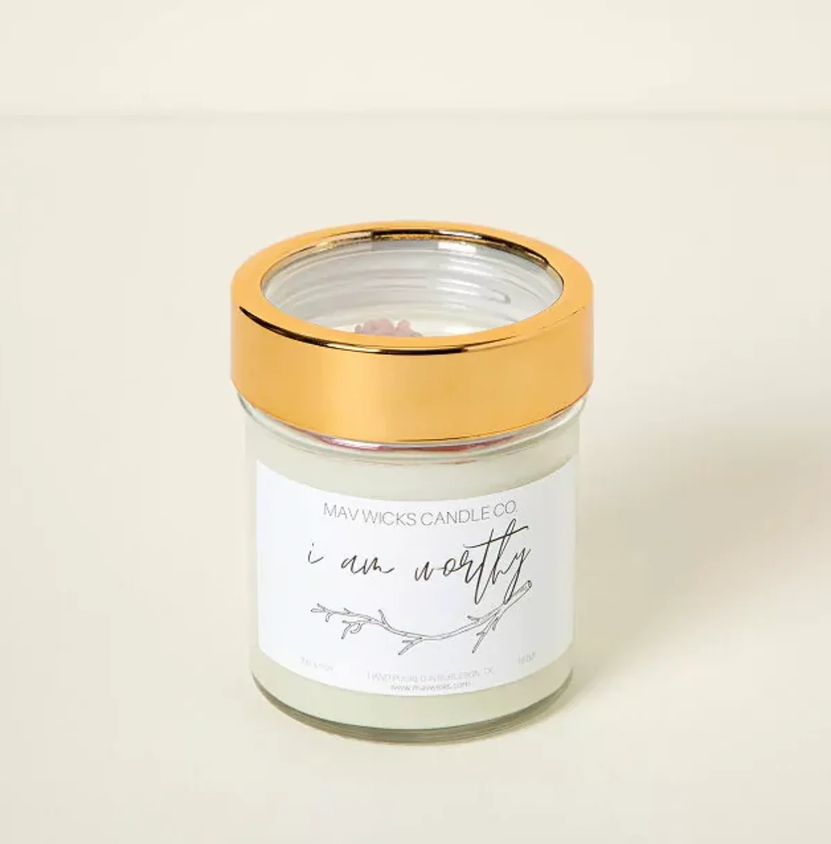 Send a positive and embracing note with this beautiful Self Love Candle emblazoned with an uplifting reminder: "I Am Worthy". A stylish gold lid with a clear glass top allows you to look into the candle, where you see dainty florals around the wick - a delicate and charming touch that enhances the thoughtful nature of this sweet and bright (pun intended) little gift.