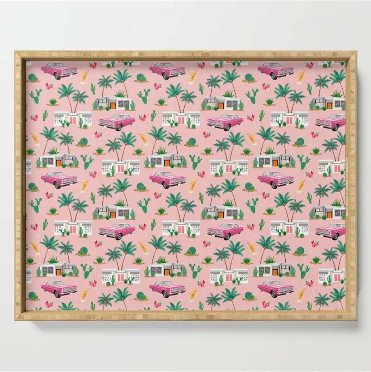 What could possibly be as iconic as Barbie's dreamy house? Her zippy pink car, of course! This decorative tray pays homage to B's hot wheels and Palm Springs vibes with a kitschy motif of flamingo pink Cadillacs, cocktails, palm trees and cacti, and casitas complete with breeze blocks. The high quality, glossy art print is set onto super durable, eco-friendly bamboo. Use it to serve up some tiki drinks and snacks or as a decor piece and catchall!