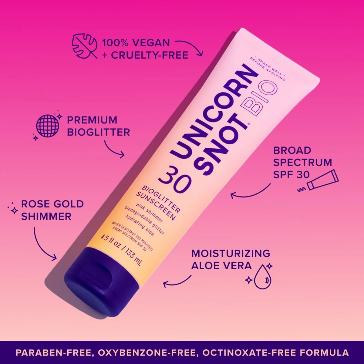 Stay sun-safe this summer and extra shimmery with a glittery sunscreen made to protect from harsh UV rays. This water-resistant formula has SPF 30, and a sparkly sheen that adds a fun, playful feel to your daily skincare routine. The blendable formula smells like citrus and cake for all the summer vibes.