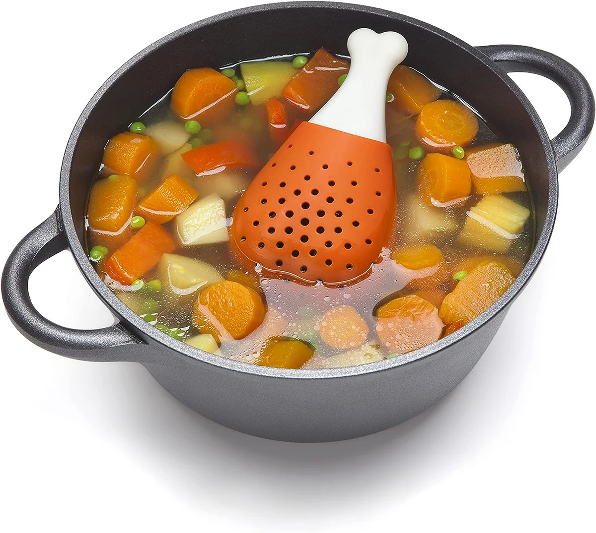 I love simmering homemade soup for hours while the cozy aroma fills the house. What I don't love? Fishing all the bay leaves and herb fragments out when it's done! This clever silicone herb infuser shaped like a chicken leg is perforated to let the flavor out but keep the floating detritus in for easy removal
