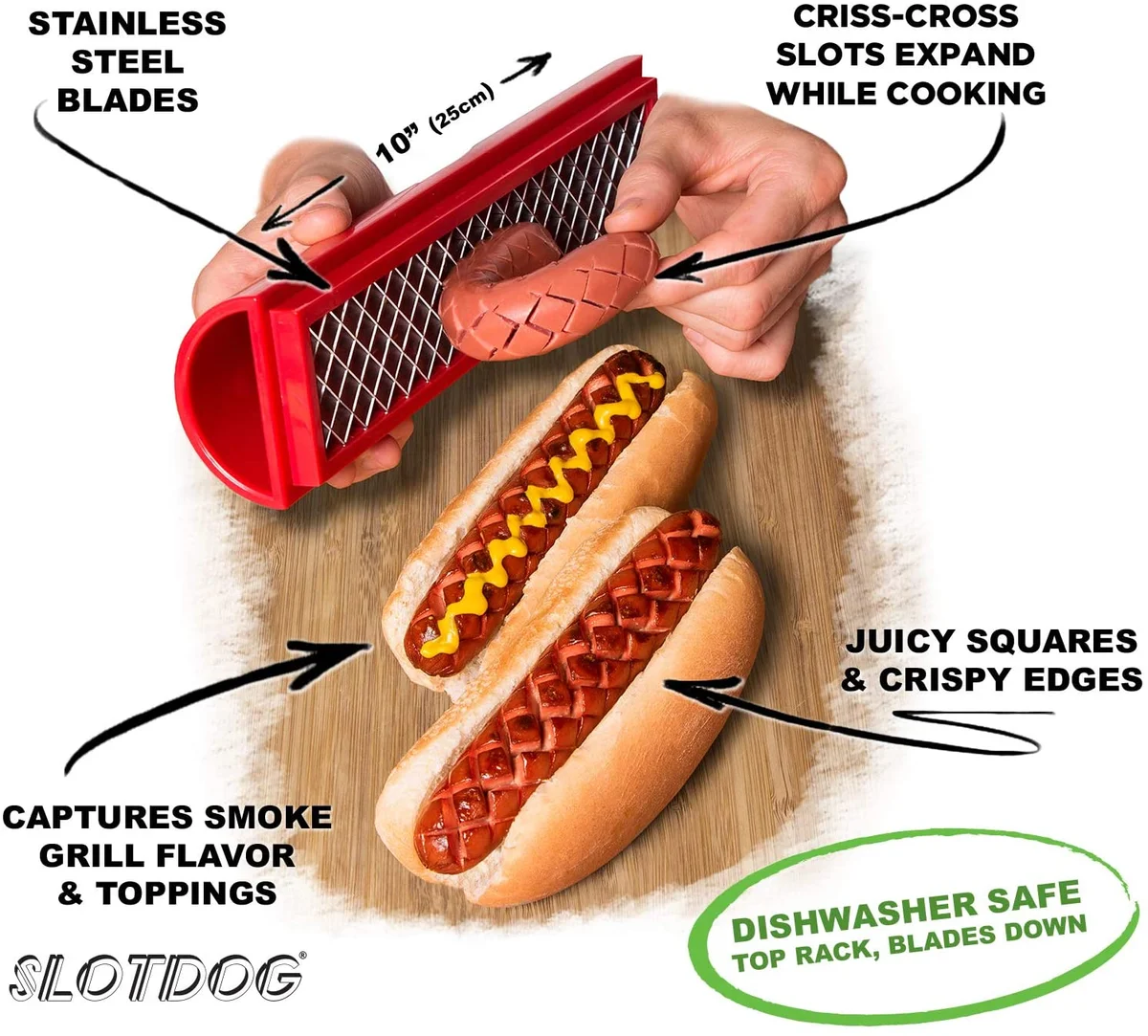 Let's be real: normal, run-of-the-mill hot dogs could use an upgrade, and that's where the Slotdog shines. The Slotdog's network of sharp, steel blades create hatched scoring lines across your hot dog, which soon blossom into risen squares of deliciousness after hitting the grill. Not only does the Slotdog maximize the savory char on your hot dog, but also provides plenty of nooks and crannies for all your condiments to sink into.