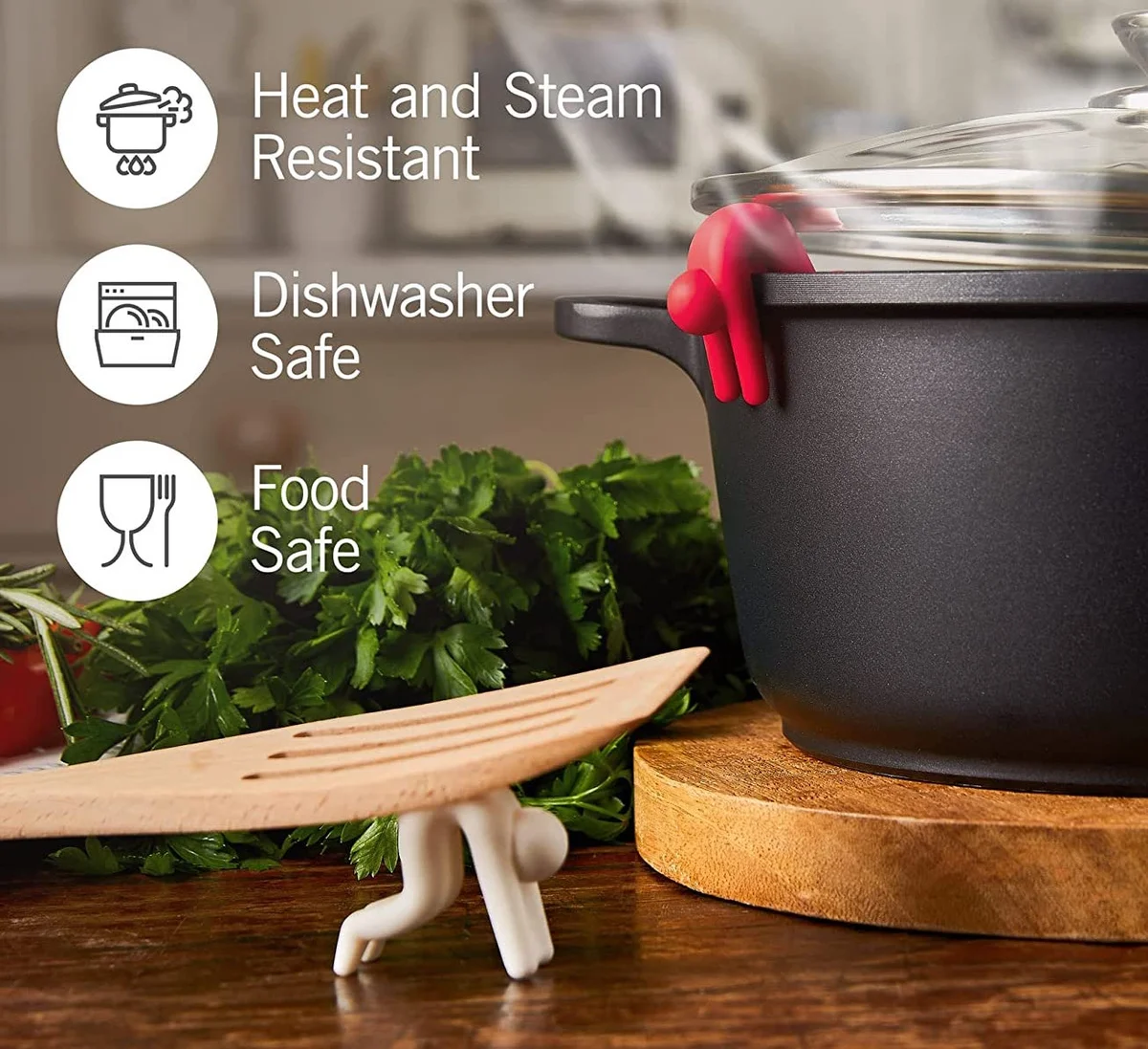 He's called Lid Sid the Pot Lifter, and he does exactly that: lifts your pot tops to mitigate boil-over. Just clip him on the edge of your pot, and you've got a silicone buddy keeping your stovetops clean. And speaking of, you get two Lid Sids per pack, and can use your second as a convenient spoon prop on your stovetop.