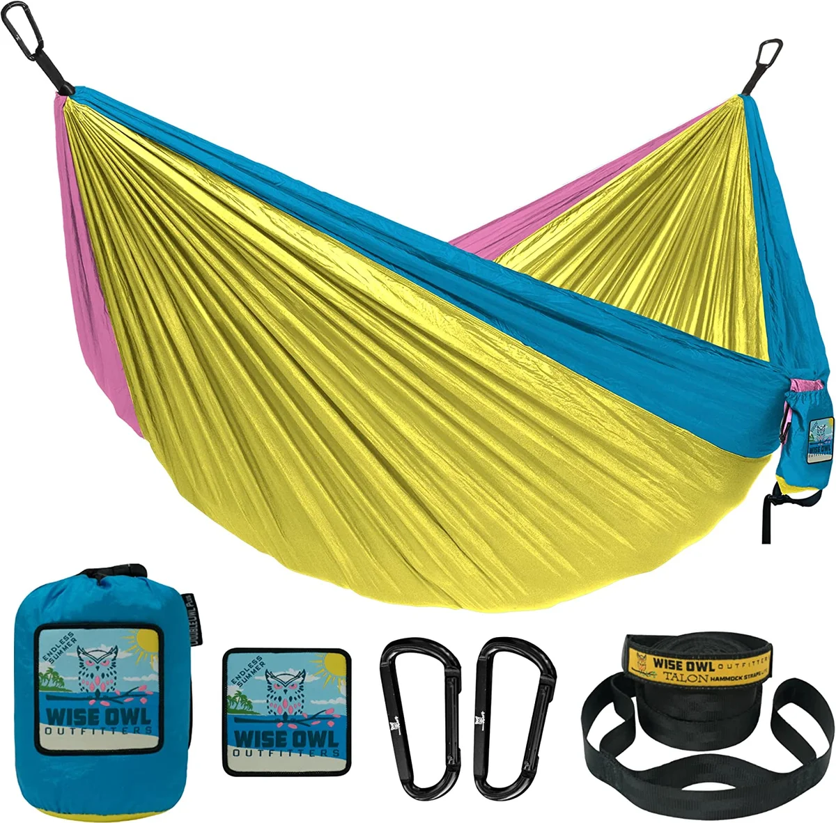 I was blown away by this Wise Owl Outfitters Hammock with over 40,000 five-star reviews! It checks all the boxes for indoor and outdoor adventures: packable attached storage bag, heavy-duty carabiners, and talon straps. Another cool feature is that this hammock has five separate loops so that you can adjust it to your desired height. It's made of soft, durable parachute nylon and measures 9 feet in length and 4.5 feet in width. No worries if this hammock takes a hit from the weather or spills; it's machine washable, and you can hang it to dry.