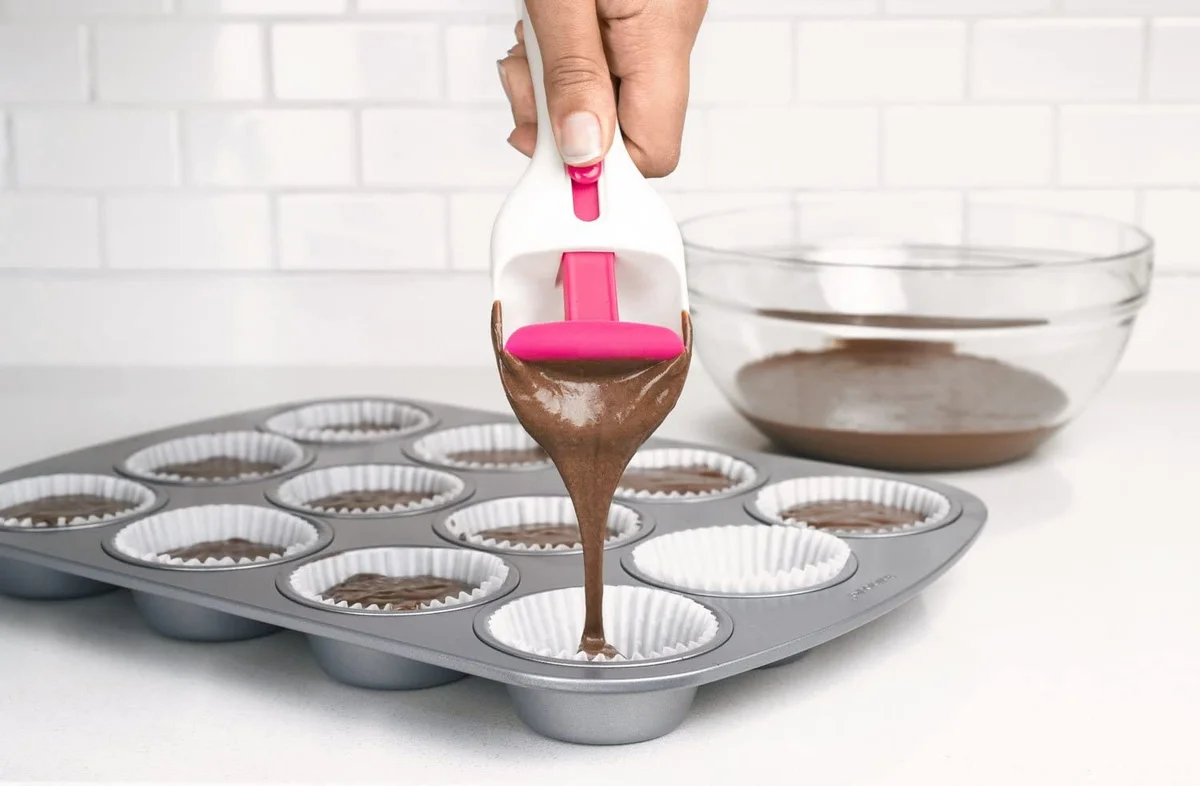 You've prepped and mixed the cupcake batter, and now it's time to pour them into their holders. But you know there will most likely be a mess or some uneven cupcake batter distribution. Not to worry! This Cupcake Scoop by Tovolo is a spatula and scooper in one tool. Simply scoop your desired cupcake batter, then move the slider on the handle to pour it into each holder. This kitchen tool minimizes the mess from the mixing bowl to the cupcake baking pan.