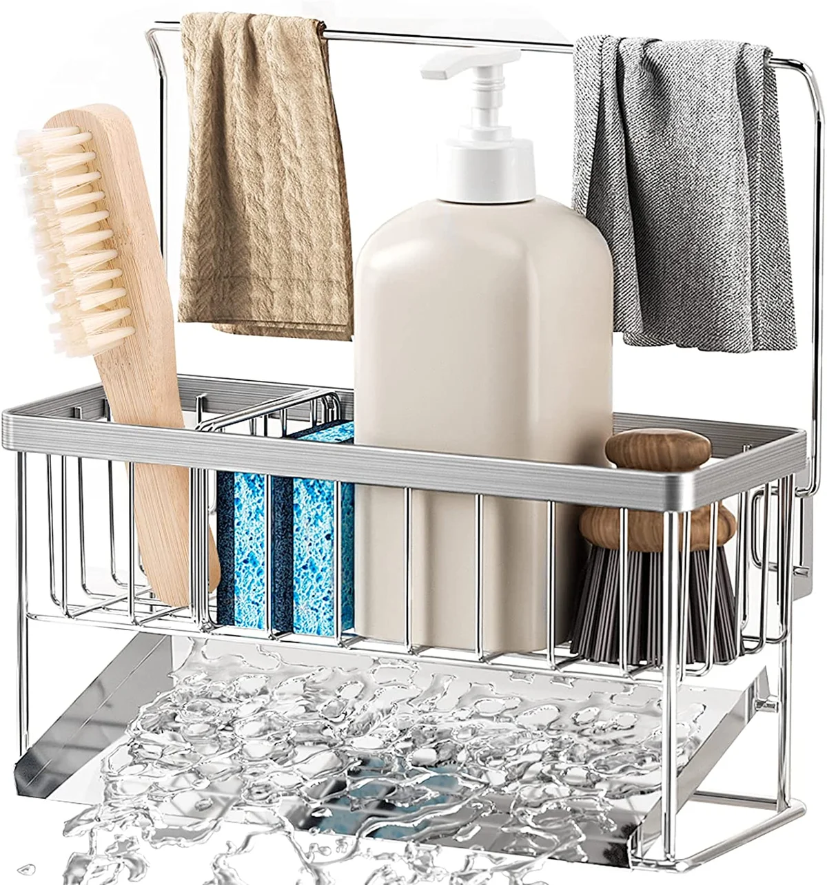 Avoid the build-up of excess soap and water with this rustproof sink caddy. A slanted tray is under this caddy for a fast drain into your sink. You can adjust the caddy's divider to store your sponges, brushes, soap and hang a dish towel. Declutter the space around your sink with this caddy.