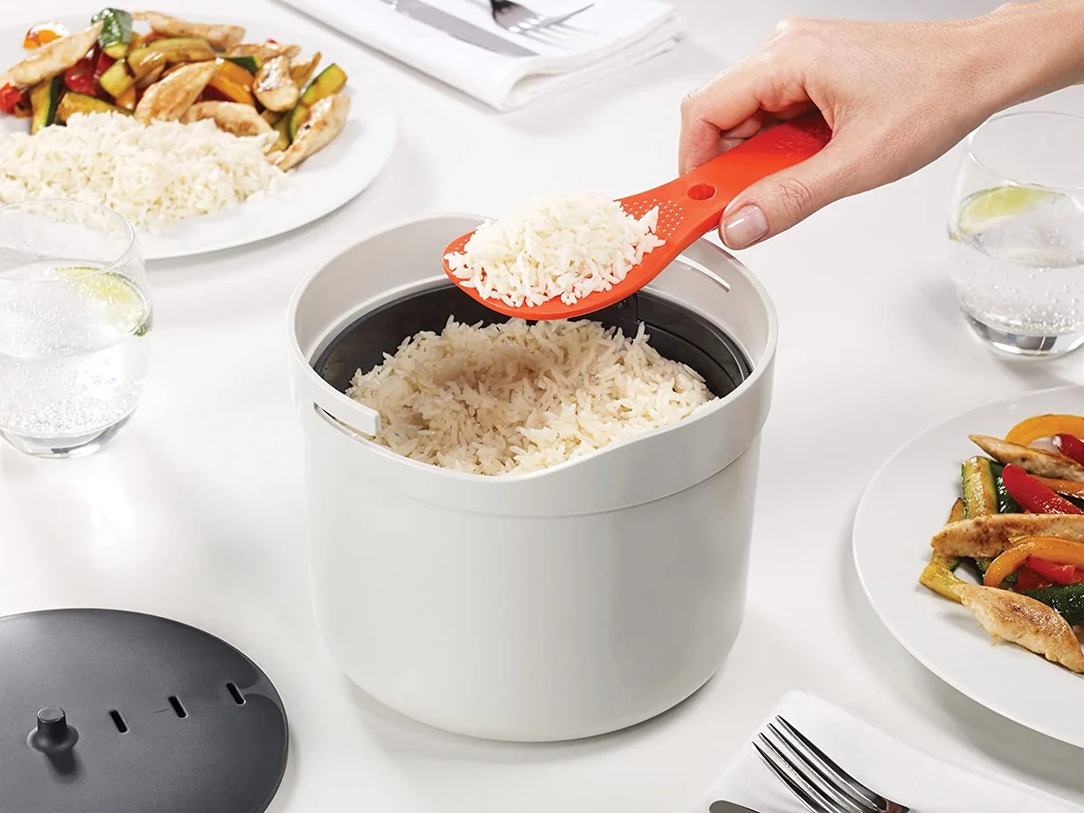 Why is rice so hard for me to get right? It should be simple, but it's my nemesis. Until I got this microwave rice cooker that makes perfectly fluffy, just right rice every time. With this set, you'll get a two liter cooking pot, a strainer to rinse your rice before cooking, a measuring cup, and a paddle for fluffing and serving.